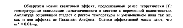 Обнаружен новый квантовый эффект, предсказанный ранее теоретически [1]: температурные осцилляции намагниченности в системе с переменной валентностью. Амплитуда осцилляции спадает с ростом температуры и уменьшением поля так же, как и для эффекта де Гааза-ван Альфена. Оценки эффективной массы дают, что т* -O.Olmo.