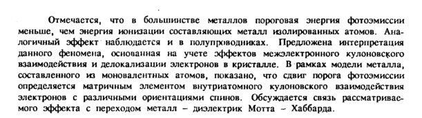 Отмечается, что в большинстве металлов пороговая энергия фотоэмиссии меньше, чем энергия ионизации составляющих металл изолированных атомов. Аналогичный эффект наблюдается и в полупроводниках. Предложена интерпретация данного феномена, основанная на учете эффектов межэлектронного кулоновского взаимодействия и делокализации электронов в кристалле. В рамках модели металла, составленного из моновалентных атомов, показано, что сдвиг порога фотоэмиссии определяется матричным элементом внутриатомного кулоновского взаимодействия электронов с различными ориентациями спинов. Обсуждается связь рассматриваемого эффекта с переходом металл диэлектрик Мотта Хаббарда.