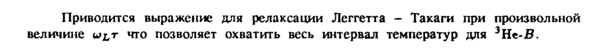 Приводится выражение для релаксации Леггетта Такаги при произвольной величине ω χ, τ что позволяет охватить весь интервал температур для