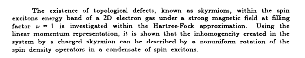 The existence of topological defects, known as skyrmions, within the spin excitons energy band of a 2D electron gas under a strong magnetic field at filling factor ν ~ I is investigated within the Hartree-Fock approximation. Using the linear momentum representation, it is shown that the inhomogeneity created in the system by a charged skyrmion can be described by a nonuniform rotation of the spin density operators in a condensate of spin excitons.