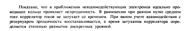 Показано, что в приближении невзаимодействующих электронов идеально проводящее кольцо проявляет неэргодичность. В равновесии при равном нулю среднем токе коррелятор токов не затухает со временем. При явном учете взаимодействия с резервуаром эргодичность восстанавливается, а время затухания коррелятора определяется степенью размытия дискретных уровней.