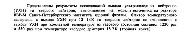 Представлены результаты исследований выхода ультрахолодных нейтронов (УХН) из твердого дейтерия, выполненные на модели источника на реакторе ВВР-М Санкт-Петербургского института ядерной физики. Фактор температурного выигрыша в выходе УХН при 13-14К из твердого дейтерия по отношению к выходу УХН при комнатной температуре из газового состояния составил 1230 раз и 550 раз при температуре твердого дейтерия 18.7 К (тройная точка).