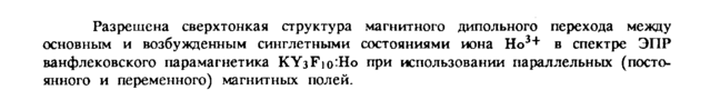 Разрешена сверхтонкая структура магнитного дипольного перехода между основным и возбужденным синглетными состояниями иона Но3+ в спектре ЭПР ванфлековского парамагнетика KYsFio^Ho при использовании параллельных (постоянного и переменного) магнитных полей.