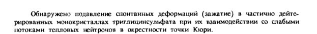 Обнаружено подавление спонтанных деформаций (зажатие) в частично дейте-рированных монокристаллах тркглицинсульфата при их взаимодействии со слабыми потоками тепловых нейтронов в окрестности точки Кюри.