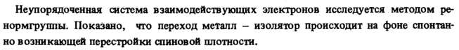 Неупорядоченная система взаимодействующих электронов исследуется методом ре-нормгруппы. Показано, что переход металл изолятор происходит на фоне спонтанно возникающей перестройки спиновой плотности.