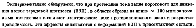 Экспериментально обнаружено, что при протекании тока выше порогового для движения волны зарядовой плотности (ВЗП), в области образца на длине « 100 мкм за токовыми контактами возникает электрическое поле противоположного знака и возрастает проводимость. Эти эффекты связываются с деформацией ВЗП в приконтактной области.