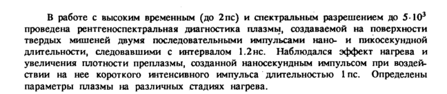 В работе с высоким временным (до 2пс) и спектральным разрешением до 5103 проведена рентгеноспектральная диагностика плазмы, создаваемой на поверхности твердых мишеней двумя последовательными импульсами на нои пикосекундной длительности, следовавшими с интервалом 1.2 нс. Наблюдался эффект нагрева и увеличения плотности преплазмы, созданной наносекундным импульсом при воздействии на нее короткого интенсивного импульса длительностью 1 пс. Определены параметры плазмы на различных стадиях нагрева.