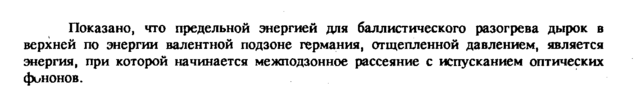 Показано, что предельной энергией для баллистического разогрева дырок в верхней по энергии валентной подзоне германия, отщепленной давлением, является энергия, при которой начинается межподзонное рассеяние с испусканием оптических финонов.