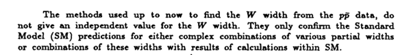 The methods used up to now to find the W width from the pp data, do not give an independent value for the W width. They only confirm the Standard Model (SM) predictions for either complex combinations of various partial widths or combinations of these widths with results of calculations within SM.