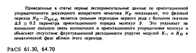 Приведенные в статье первые экспериментальные данные по ориентационной упорядоченности дискоидного возвратного нематика iVD показывают, что фазовый переход — D^o^ является сильным переходом первого рода с большим скачком AS ~ 0.2 параметра ориентационного порядка молекул S. Это указывает на аномально сильную связь колоночного и ориентационного упорядочения молекул и объясняет отсутствие флуктуационной расходимости упругих модулей К\\ и Кц в нематической фазе вблизи этого перехода. PACS 61.30, 64.70