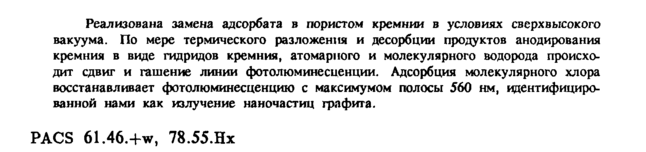 Реализована замена адсорбата в пористом кремнии в условиях сверхвысокого вакуума. По мере термического разложения и десорбции продуктов анодирования кремния в виде гидридов кремния, атомарного и молекулярного водорода происходит сдвиг и гашение линии фотолюминесценции. Адсорбция молекулярного хлора восстанавливает фотолюминесценцию с максимумом полосы 560 нм, идентифицированной нами как излучение наночастиц графита. PACS 61.46.+W, 78.55.Hx
