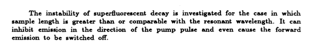 The instability of supcrfluorescent decay is investigated for the case in which sample length is greater than or comparable with the resonant wavelength. It can inhibit emission in the direction of the pump pulse and even cause the forward emission to be switched off.