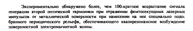 Экспериментально обнаружено более, чем 100-кратное возрастание сигнала генерации второй оптической гармоники при отражении фемтосекундных лазерных импульсов от металлической поверхности при нанесении на нее специально подобранного периодического рельефа, обеспечивающего квазирезонансное возбуждение поверхностной электромагнитной волны.