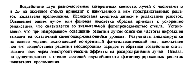 Воздействие двух разночастотных когерентных световых лучей с частотами ω и 2и> на оксидное стекло приводит к накоплению в нем пространственных решеток показателя преломления. Исследована кинетика записи и релаксации решеток. Освещение одним лучом или фоновая подсветка образца приводят к ускорению релаксации, что связывается со значительной фотопроводимостью стекла. Установлено, что при непрерывном освещении решетки лучом основной частоты дифракция выходит на остаточный самоподдерживающийся уровень. Результаты анализируются на основе модели, включающей когерентный фотогальванический ток, накопление под его воздействием решетки неоднородных зарядов и обратное воздействие статического поля через электрооптические эффекты на распространение лучей. Показано существование в стекле световой неустойчивости фотоиндуцированных решеток показателя преломления.