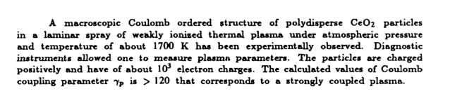 A macroscopic Coulomb ordered structure of polydisperse СеОг particles in a laminar spray of weakly ionized thermal plasma under atmospheric pressure and temperature of about 1700 К has been experimentally observed. Diagnostic instruments allowed one to measure plasma parameters. The particles are charged positively and have of about ΙΟ3 electron charges. The calculated values of Coulomb coupling parameter 7P is > 120 that corresponds to a strongly coupled plasma.