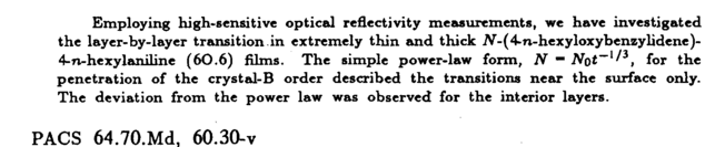 Employing high-sensitive optical refiectivity measurements, we have investigated the layer-by-layer transition.in extremely thin and thick iV-(4-n-hexyloxybenzylidene)-4-n-hexylaniline (6О.6) films. The simple power-law form, Ν ~ iVoi-1^3, for the penetration of the crystal-B order described the transitions near the surface only. The deviation from the power law was observed for the interior layers. PACS 64.70.Md, 60.30-v