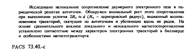 Исследовано нелокальное сопротивление двумерного электронного газа в периодической решетке антиточек. Обнаружен аномальный рост этого сопротивления при выполнении условия 2ЯС та d (Rc ларморовский радиус), вызванный возникновением траекторий, скачущих по антиточкам и убегающих вдоль их рядов. На основе сравнительного анализа локального и нелокального магнетосопротивления установлено соответствие между характером электронных траекторий в биллиарде и особенностями магнетотранспорта. PACS 73.40.-c