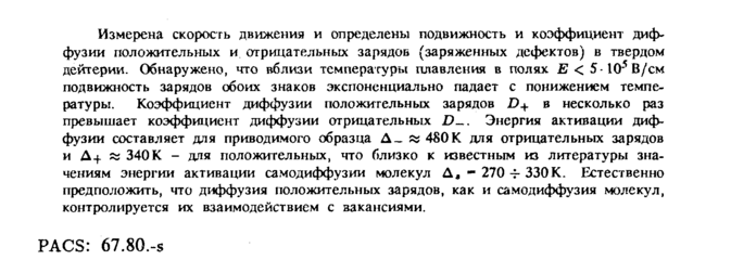 Измерена скорость движения и определены подвижность и коэффициент диффузии положительных и отрицательных зарядов (заряженных дефектов) в твердом дейтерии. Обнаружено, что вблизи температуры плавления в полях Ε < 5105 В/см подвижность зарядов обоих знаков экспоненциально падает с понижением температуры. Коэффициент диффузии положительных зарядов D+ в несколько раз превышает коэффициент диффузии отрицательных D-. Энергия активации диффузии составляет для приводимого образца Δ_ w 480 К для отрицательных зарядов и Δ+ й; 340К для положительных, что близко к известным из литературы значениям энергии активации самодиффузии молекул Δ, 270 -f 330К. Естественно предположить, что диффузия положительных зарядов, как и самодиффузия молекул, контролируется их взаимодействием с вакансиями. PACS: 67.80.-s