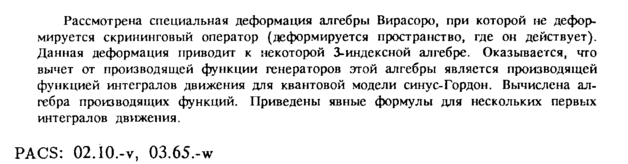 Рассмотрена специальная деформация алгебры Вирасоро, при которой не деформируется скрининговый оператор (деформируется пространство, где он действует). Данная деформация приводит к некоторой 3-индексной алгебре. Оказывается, что вычет от производящей функции генераторов этой алгебры является производящей функцией интегралов движения для квантовой модели синус-Гордон. Вычислена алгебра производящих функций. Приведены явные формулы для нескольких первых интегралов движения. PACS: 02.10.-v, 03.65.-w