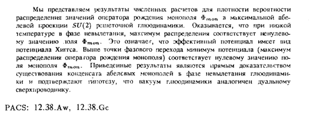 Мы представляем результаты численных расчетов для плотности вероятности распределения значений оператора рождения монополя Фтол в максимальной абе-левой проекции S{7(2) решеточной глюодинамики. Оказывается, что при низкой температуре в фазе невылетания, максимум распределения соответствует Heir/левому значению юля Фтт. Это означает, что эффективный потенциал имеет вид потенциала Хиггса. Выше точки фазового перехода минимум потенциала (максимум распределения оператора рождения монополя) соответствует ну левому значению поля монополя ФтояПриведенные результаты являются прямым доказательством существования конденсата абелсвых монополей s фазе невылетания глюодинамики и подтверждают гипотезу, что вакуум глюодинамики аналогичен дуальному сверхпроводнику. PACS: 12.38.Aw, 12.38.Gc