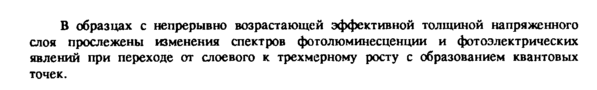 В образцах с непрерывно возрастающей эффективной толщиной напряженного слоя прослежены изменения спектров фотолюминесценции и фотоэлектрических явлений при переходе от слоевого к трехмерному росту с образованием квантовых точек.