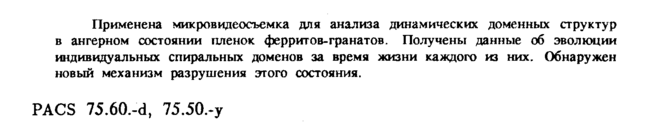 Применена микровидеосъемка для анализа динамических доменных структур в ангерном состоянии пленок ферритов-гранатов. Получены данные об эволюции индивидуальных спиральных доменов за время жизни каждого из них. Обнаружен новый механизм разрушения этого состояния. PACS 75.60.-d, 75.50.-y