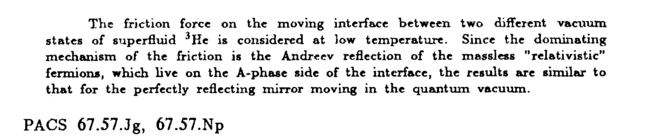 The friction force on the moving interface between two different vacuum states of superfluid 3He is considered at low temperature. Since the dominating mechanism of the friction is the Andrecv reflection of the mass]ess "relativistic" fermions, which live on the Α-phase side of the interface, the results are similar to that for the perfectly reflecting mirror moving in the quantum vacuum. PACS 67.57.Jg, 67.57.Np