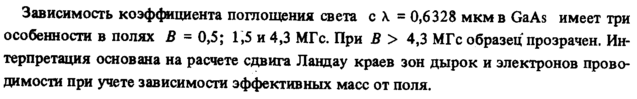 Зависимость коэффициента поглощения света с λ = 0,6328 мкмв GaAs имеет три особенности в полях В =0,5; 1,5 и 4,3 МГс. При В > 4,3 МГс образец прозрачен. Интерпретация основана на расчете сдвига Ландау краев зон дырок и электронов проводимости при учете зависимости эффективных масс от поля.