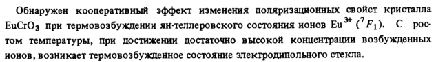 Обнаружен кооперативный эффект изменения поляризационных свойст кристалла ЕиСгОз при термовозбуждении ян-теллеровского состояния ионов Eu ( Fx). С ростом температуры, при достижении достаточно высокой концентрации возбужденных ионов, возникает термовозбужденное состояние электродипольного стекла.