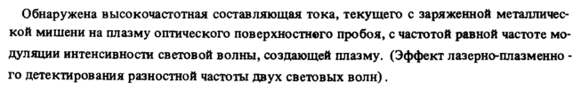 Обнаружена высокочастотная составляющая тока, текущего с заряженной металлической мишени на плазму оптического поверхностного пробоя, с частотой равной частоте модуляции интенсивности световой волны, создающей плазму. (Эффект лазерно-плазменно -го детектирования разностной частоты двух световых волн).