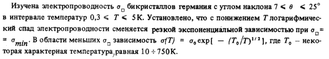 Изучена электропроводность aQ бикристаллов германия с углом наклона Ί < θ < 25° в интервале температур 0,3 < Τ < 5 К. Установлено, что с понижением Τ логарифмический спад электропроводности сменяется резкой экспоненциальной зависимостью при σπ= = °min ^ области меньших oQ зависимость afT) а0ехр[ — (Т0/Т)и2 ], где Т0 некоторая характерная температура равная 10 -г750К.
