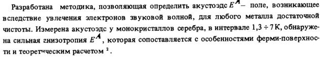 Разработана методика, позволяющая определить акустоэдсЯ поле, возникающее вследствие увлечения электронов звуковой волной, для любого металла достаточной чистоты. Измерена акустоэдс у монокристаллов серебра, в интервале 1,3-г 7 К, обнаружена сильная анизотропия ЕА, которая сопоставляется с особенностями ферми-поверхнос-ти и теоретическим расчетом 2.