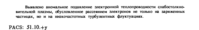 Выявлено аномальное подавление электронной теплопроводности слабостолкно-вительной плазмы, обусловленное рассеянием электронов не только на заряженных частицах, но и на низкочастотных турбулентных флуктуациях. Ρ ACS: 51.10.-f-y