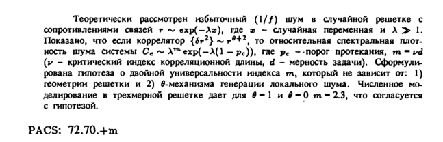 Теоретически рассмотрен избыточный (1//) шум в случайной решетке с сопротивлениями связей г ~ ехр(—Ах), где χ случайная переменная и λ > 1. Показано, что если коррелятор {Sr*} ~ г*+2, то относительная спектральная плотность шума системы С„ ~ λ™ ехр(—λ(1 — рс)), где рс порог протекания, m vd {ν критический индекс корреляционной длины, d мерность задачи). Сформулирована гипотеза о двойной универсальности индекса т, который не зависит от: 1) геометрии решетки и 2) 9-механизма генерации локального шума. Численное моделирование в трехмерной решетке дает для 9-1 и в 0 m 2.3, что согласуется с гипотезой. PACS: 72.70.-fm
