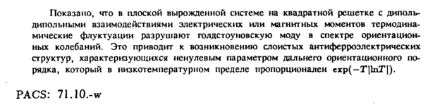 Показано, что в плоской вырожденной системе на квадратной решетке с диполь-дипольными взаимодействиями электрических или магнитных моментов термодинамические флуктуации разрушают голдстоуновскую моду в спектре ориентацион-ных колебаний. Это приводит к возникновению слоистых антиферроэлектрических структур, характеризующихся ненулевым параметром дальнего ориентационного порядка, который в низкотемпературном пределе пропорционален ехр(—Г|1пТ|). PACS: 71.10.-w