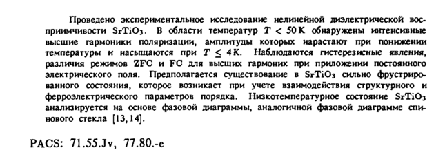 Проведено экспериментальное исследование нелинейной диэлектрической восприимчивости SrTiC>3. В области температур Τ < 50 К обнаружены интенсивные высшие гармоники поляризации, амплитуды которых нарастают при понижении температуры и насыщаются при Τ < 4 К. Наблюдаются гистерезисные явления, различия режимов ZFC и FC для высших гармоник при приложении постоянного электрического поля. Предполагается существование в ЭгТЮз сильно фрустриро-ванного состояния, которое возникает при учете взаимодействия структурного и ферроэлектрического параметров порядка. Низкотемпературное состояние SrTiOj анализируется на основе фазовой диаграммы, аналогичной фазовой диаграмме спинового стекла [13,14]. PACS: 71.55.Jv, 77.80.-е