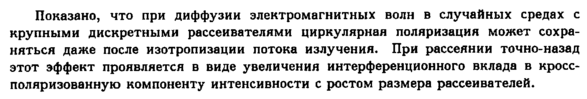 Показано, что при диффузии электромагнитных волн в случайных средах с крупными дискретными рассеивателями циркулярная поляризация может сохраняться даже после изотропизации потока излучения. При рассеянии точно-назад этот эффект проявляется в виде увеличения интерференционного вклада в кросс-поляризованную компоненту интенсивности с ростом размера рассеивателей.
