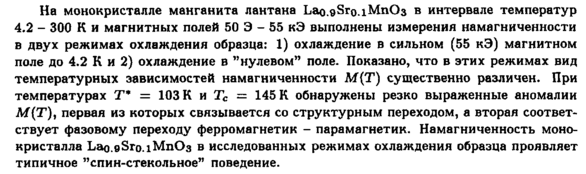 На монокристалле манганита лантана Ьао.дЯголМпОз в интервале температур 4.2 300 К и магнитных полей 50 Э 55 кЭ выполнены измерения намагниченности в двух режимах охлаждения образца: 1) охлаждение в сильном (55 кЭ) магнитном поле до 4.2 К и 2) охлаждение в "нулевом" поле. Показано, что в этих режимах вид температурных зависимостей намагниченности М(Т) существенно различен. При температурах Т* = 103 К и Тс = 145 К обнаружены резко выраженные аномалии М(Т), первая из которых связывается со структурным переходом, а вторая соответствует фазовому переходу ферромагнетик парамагнетик. Намагниченность монокристалла Lao.gSro.iMnOs в исследованных режимах охлаждения образца проявляет типичное "спин-стекольное" поведение.