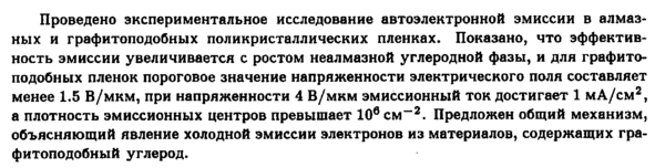 Проведено экспериментальное исследование автоэлектронной эмиссии в алмазных и графитоподобных поликристаллических пленках. Показано, что эффективность эмиссии увеличивается с ростом неалмазной углеродной фазы, и для графитоподобных пленок пороговое значение напряженности электрического поля составляет менее 1.5 В/мкм, при напряженности 4 В/мкм эмиссионный ток достигает 1 мА/см2, а плотность эмиссионных центров превышает 10е см~2. Предложен общий механизм, объясняющий явление холодной эмиссии электронов из материалов, содержащих гра-фитоподобный углерод.