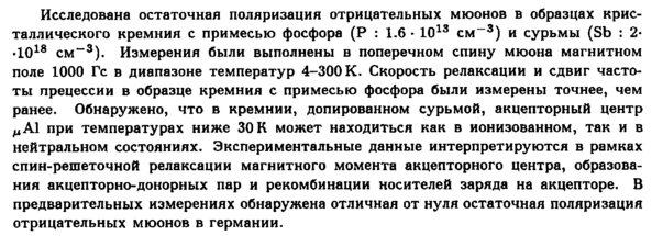 Исследована остаточная поляризация отрицательных мюонов в образцах кристаллического кремния с примесью фосфора (Р : 1.6 1013 см-3) и сурьмы (Sb : 2· •1018 см-3). Измерения были выполнены в поперечном спину мюона магнитном поле 1000 Гс в диапазоне температур 4-300 К. Скорость релаксации и сдвиг частоты прецессии в образце кремния с примесью фосфора были измерены точнее, чем ранее. Обнаружено, что в кремнии, допированном сурьмой, акцепторный центр μΧί при температурах ниже 30 К может находиться как в ионизованном, так и в нейтральном состояниях. Экспериментальные данные интерпретируются в рамках спин-решеточной релаксации магнитного момента акцепторного центра, образования акцепторно-донорных пар и рекомбинации носителей заряда на акцепторе. В предварительных измерениях обнаружена отличная от нуля остаточная поляризация отрицательных мюонов в германии.