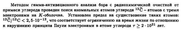 Методом гамма-активационного анализа бора с радиохимической очисткой от примеси углерода проведен поиск аномальных атомов углерода 12С атомов с тремя электронами на К-оболочке. Установлен предел на существование таких атомов: 12С/12С < 2,5·10~12, что соответствует ограничению на время жизни по отношению к нарушению принципа Паули электронами в атоме углерода г > 2 · 1021 лет.