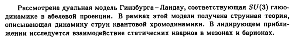 Рассмотрена дуальная модель Гинзбурга-Ландау, соответствующая SU(3) глюо-динамике в абелевой проекции. В рамках этой модели получена струнная теория, описывающая динамику струн квантовой хромодинамики. В лидирующем приближении исследуется взаимодействие статических кварков в мезонах и барионах.
