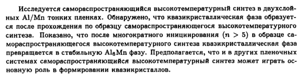 Исследуется самораспространяющийся высокотемпературный синтез в двухслойных А1/Мп тонких пленках. Обнаружено, что квазикристаллическая фаза образуется после прохождения по образцу самораспространяющегося высокотемпературного синтеза. Показано, что после многократного инициирования (п > 5) в образце самораспространяющегося высокотемпературного синтеза квазикристаллическая фаза превращается в стабильную AleMn фазу. Предполагается, что и в других пленочных системах самораспространяющийся высокотемпературный синтез может играть основную роль в формировании квазикристаллов.