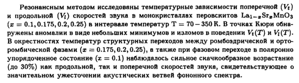 Резонансным методом исследованы температурные зависимости поперечной (Vt) и продольной (Vi) скоростей звука в монокристаллах перовскитов Lai-aSr-pMnOa (χ = 0.1,0.175,0.2,0.25) в интервале температур Τ = 70-350 К. В точках Кюри обнаружены аномалии в виде небольших минимумов и изломов в поведении Vt(T) и Ц(Т). В окрестностях температур структурных переходов между ромбоэдрической и орто-ромбической фазами (х — 0,175,0.2,0.25), а также при фазовом переходе в поляронно упорядоченное состояние (х = 0,1) наблюдалось сильное скачкообразное возрастание (до 30%) как продольной, так и поперечной скоростей звука, свидетельствующее о значительном ужесточении акустических ветвей фононного спектра.