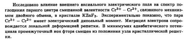Исследовано влияние внешнего аксиального электрического поля на спектр поглощения парного центра смешанной валентности Сг3+ — Сг2+, связанного механизмом двойного обмена, в кристалле KZ11F3. Экспериментально показано, что пара Сг3+ — Сг2+ имеет электрический дипольный момент. Миграция электрона сопровождается локальной деформацией решетки. В минимумах адиабатического потенциала промежуточный ион фтора смещен из положения узла кристаллической решетки.
