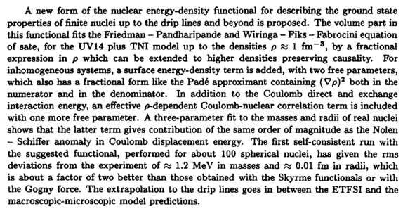 Λ new form of the nuclear energy-density functional for describing the ground state properties of finite nuclei up to the drip lines and beyond is proposed. The volume part in this functional fits the Friedman Pandharipande and Wiringa Fiks Fabrocini equation of sate, for the UV14 plus TNI model up to the densities ρ ы I fm-3, by a fractional expression in ρ which can be extended to higher densities preserving causality. For inhomogeneous systems, a surface energy-density term is added, with two free parameters, which also has a fractional form like the Pade approximant containing (Vp)2 both in the numerator and in the denominator. In addition to the Coulomb direct and exchange interaction energy, an effective p-dependent Coulomb-nuclear correlation term is included with one more free parameter. A three-parameter fit to the masses and radii of real nuclei shows that the latter term gives contribution of the same order of magnitude as the Nolen Schiffer anomaly in Coulomb displacement energy. The first self-consistent run with the suggested functional, performed for about 100 spherical nuclei, has given the rms deviations from the experiment of w 1.2 MeV in masses and « 0.01 fm in radii, which is about a factor of two better than those obtained with the Skyrme functionals or with the Gogny force. The extrapolation to the drip lines goes in between the ETFSI and the macroscopic-microscopic model predictions.