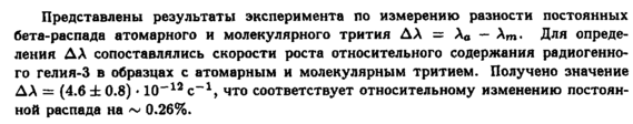 Представлены результаты эксперимента по измерению разности постоянных бета-распада атомарного и молекулярного трития Δλ = λ0 Am. Для определения Δλ сопоставлялись скорости роста относительного содержания радиогенного гелия-3 в образцах с атомарным и молекулярным тритием. Получено значение ΔΑ = (4.6 ± 0.8) · Ю-12 с-1, что соответствует относительному изменению постоянной распада на ~ 0.26%.