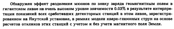 Обнаружен эффект разделения мюонов по знаку заряда геомагнитным полем в гигантском ливне на очень высоком уровне значимости 0.03% в результате интерпретации показаний всех сработавших детекторных станций в этом ливне, зарегистрированном на Якутской установке, в рамках модели кварк-глюонных струн на основе расчетов откликов этих станций с учетом и без учета магнитного поля Земли.