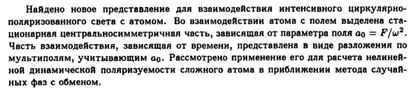 Найдено новое представление для взаимодействия интенсивного циркулярно-поляризованного света с атомом. Во взаимодействии атома с полем выделена стационарная центральносимметричная часть, зависящая от параметра поля ао = F/ω2. Часть взаимодействия, зависящая от времени, представлена в виде разложения по мультиполям, учитывающим αο· Рассмотрено применение его для расчета нелинейной динамической поляризуемости сложного атома в приближении метода случайных фаз с обменом.