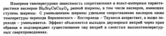 Измерена температурная зависимость сопротивления и вольт-амперные характеристики вискеров ΒίΣβ^ΟβΟιίΣΟϋ, разной ширины, в том числе вискеров, имеющих ступень ширины. С уменьшением ширины удельное сопротивление вискеров ниже температуры перехода Березинского Костерлица Таулесса возрастает, а выше перехода уменьшается. Эффект объясняется выходом двумерных вихрей через края образца и подтверждает существование пар вихрей в слоистых высокотемпературных сверхпроводниках.